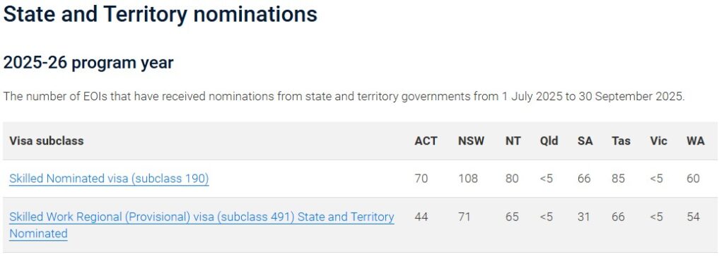 The Department has updated its website with the latest nomination figures for the Skilled Nominated visa (subclass 190) and Skilled Work Regional (Provisional) visa (subclass 491), as submitted by State and Territory governments between 1 July 2025 and 30 September 2025.